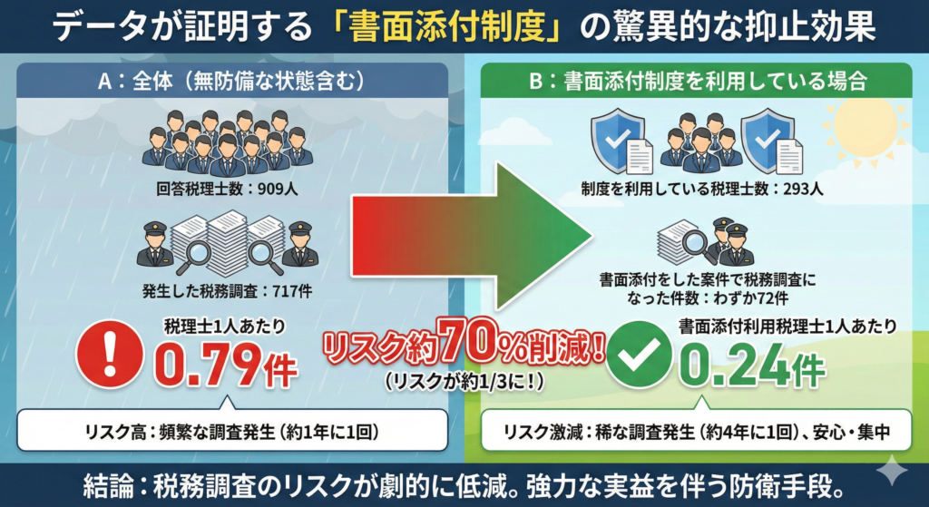 書面添付を行っている案件での調査発生頻度は、全体の平均と比べて3分の1以下に抑え込まれています。