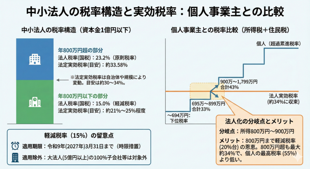 所得が800万円までは法人の軽減税率(実効税率20%台)の恩恵を受けられる。